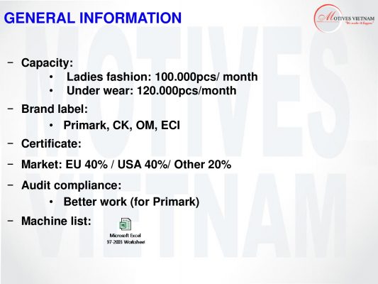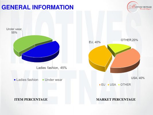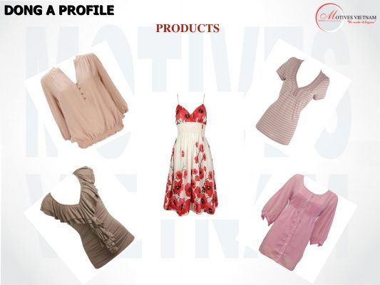 –          Sản xuất: vải các loại, quần áo các loại. Sản xuất vật tư phụ tùng phục vụ ngành dệt may