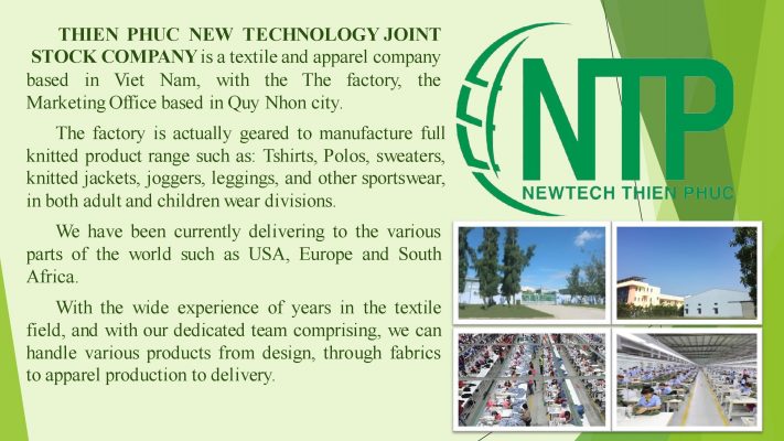 THIEN PHUC NEW TECHNOLOGY JOINT STOCK COMPANY is a textile and apparel company based in Viet Nam, with the The factory, the Marketing Office based in Quy Nhon city. The factory is actually geared to manufacture full knitted product range such as: Tshirts, Polos, sweaters, knitted jackets, joggers, leggings, and other sportswear,